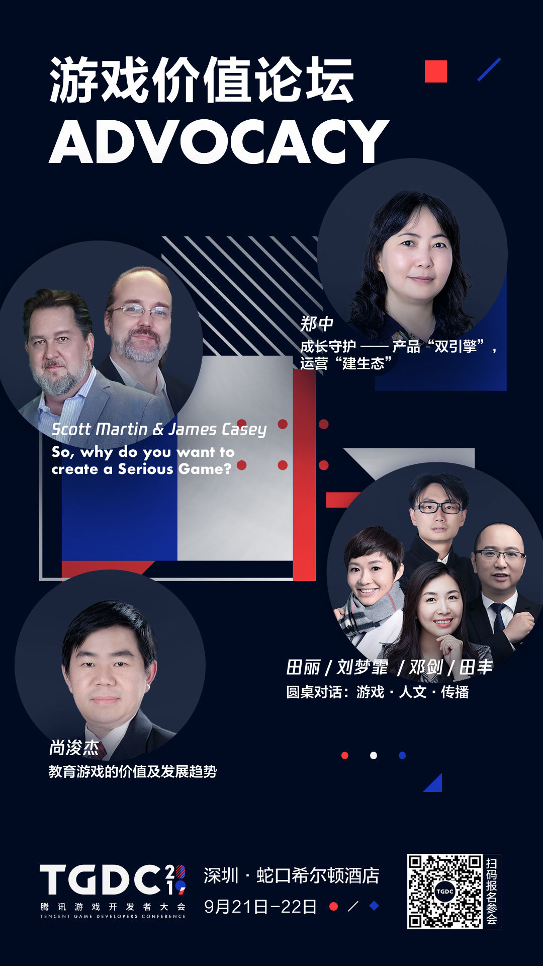 此外,本届大会新增「游戏价值」分论坛,关于如何拓展游戏价值,是从业者、专家学者和游戏热爱者们所需思考和探讨的问题。大会邀请到游戏应用价值研究领军人物、VSGI 创始董事 Scott Martin & James Casey 带来「why do you want to create a Serious Game?」的主题分享;北京大学学习科学实验室执行主任尚浚杰副教授则为大家讲述「教育游戏的价值及发展趋势」;田丽教授、刘梦霏博士、邓剑博士 、田丰博士开以「游戏 · 人文 · 传播」为主题进行圆桌对话;同时腾讯互动娱乐成长守护中心总监郑中也带来了关于「成长守护」相关的主题分享。大会希望借此契机,与行业从业者、学者等共同探讨与拓展游戏价值的边界,从社会、科技、文明和文化等多个方面来探索游戏的更多可能性。