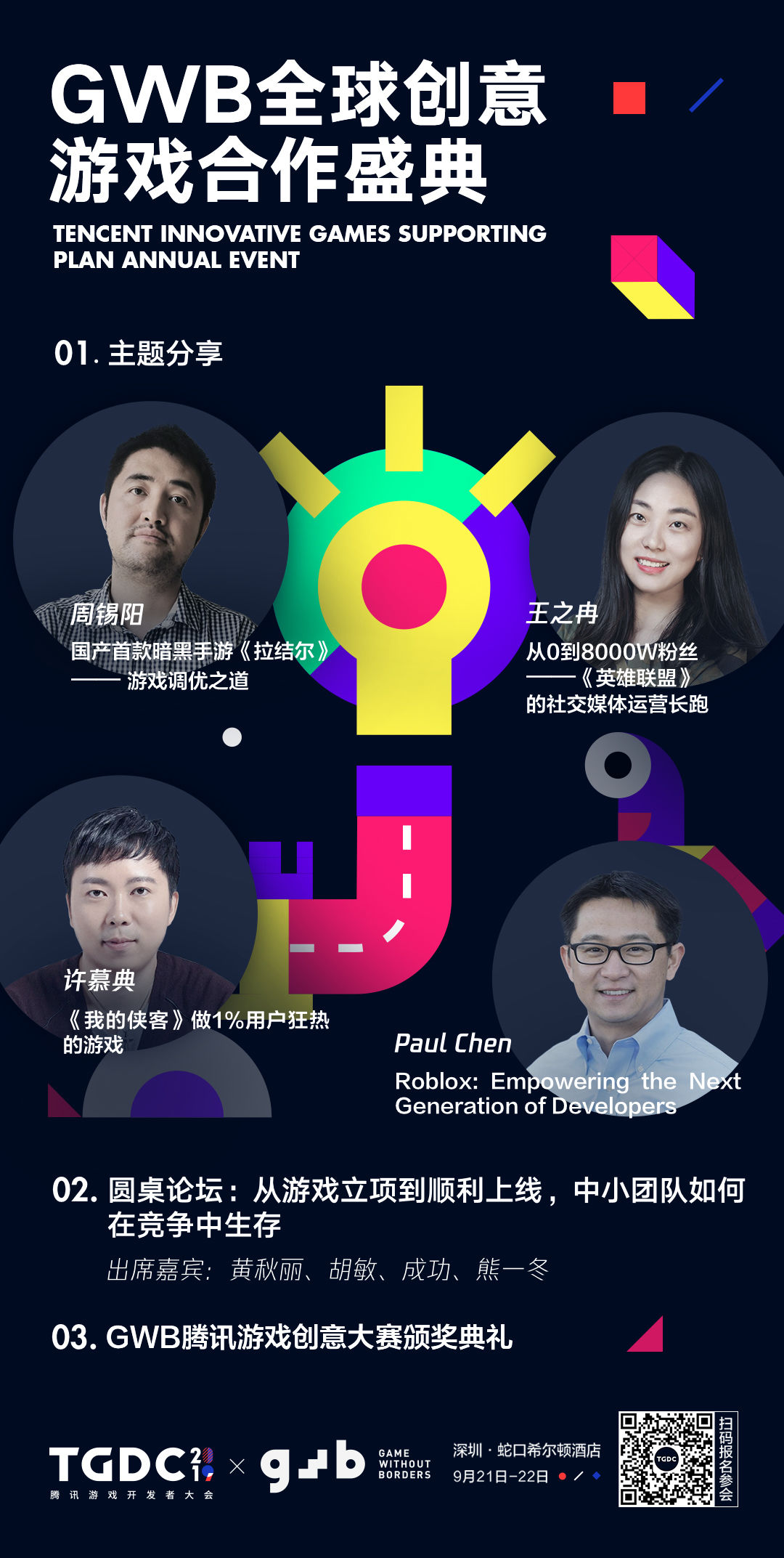 目前游戏行业发展迅速,竞争激烈,精品创意游戏是当下业界的重中之重。腾讯游戏学院的 GWB 创意游戏合作计划也将在本届 TGDC 上举办 GWB 全球创意游戏合作盛典,邀请国内外游戏专家及优质研发团队,助力更多开发者打造精品游戏。众所周知,中小开发者团队在发展过程中需要突破自身瓶颈、抓住机遇,这往往少不了外部力量的扶持。GWB 创意游戏合作计划致力于为业内创意游戏团队提供专家指导、技术支持、资金对接和发行推广等全方位服务,帮助团队打磨游戏品质,打造精品游戏!届时《拉结尔》发行制作人周锡阳将为大家分享国产首款暗黑手游《拉结尔》的调优之道。《我的侠客》执行制作人许慕典也将带来「做 1% 用户狂热的游戏」主题,腾讯互动娱乐《英雄联盟》社交媒体负责人王之冉为大家带来「从 0 到 8000 万粉丝」的经验交流分享。当天还有有精彩的圆桌论坛和 GWB 腾讯创意游戏颁奖典礼,大会期望可以带给行业从业者更多帮助,从而促进行业出现更多优质精品的游戏。