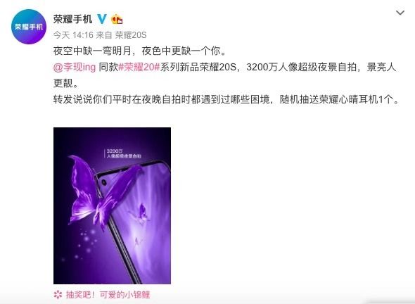 不只有「荣耀最强的自拍」,荣耀 20S 还将搭载 7nm 工艺芯片。8 月 28 日,@ 荣耀老熊就在微博表示,「凭借 3200 万像素镜头的顶级硬件,加上 7nm 芯片的超强算力,让荣耀 20S 成为当之无愧的【荣耀最强自拍手机】」。相信荣耀 20S 发布后一定会助力年轻人们用自拍记录丰富多彩的夜生活。目前,荣耀已经开启荣耀 20S 的线上线下预约:大家可以通过 Vmall、京东、天猫、苏宁易购、唯品会、国美、荣耀亲选电商平台或者扫描二维码到门店直接进行预约,还在等什么,赶紧行动吧。