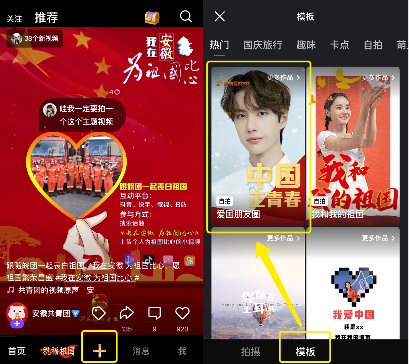 腾讯微视「爱国朋友圈」的玩法参与起来很简单,只要打开腾讯微视 APP 拍摄视频,在「模板」中选择「爱国朋友圈」模板即可拍摄同款视频,发布时勾选「同步到朋友圈」还可直接将视频分享到朋友圈中,可分享最长 30 秒的视频。