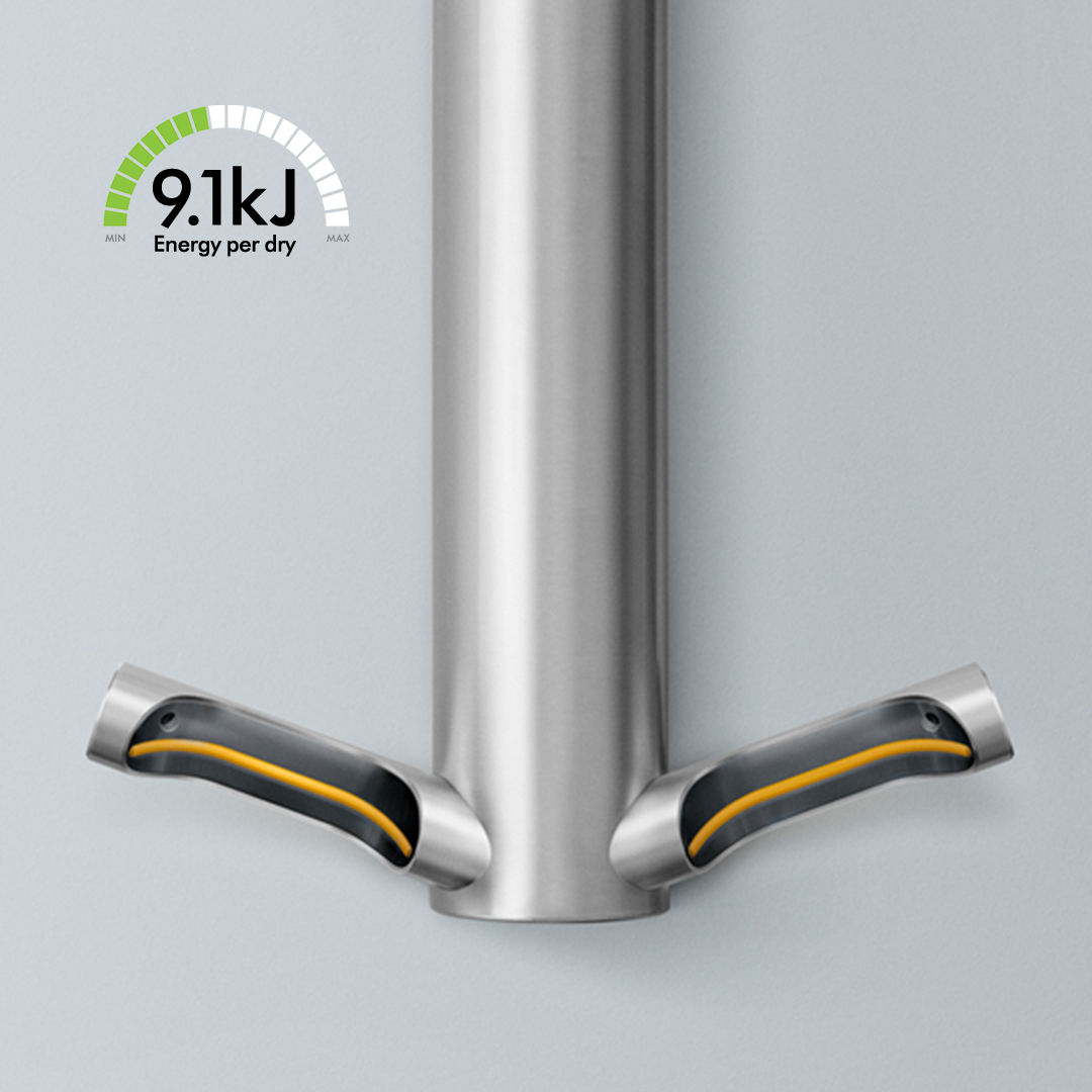Dyson Airblade 9kJ 干手器的研发历时三年,前后制作了 700 多个原型,在多方面都对既有的干手技术进行了改进与提升。该款产品是戴森史上最安静的干手器,并且可实现十秒快速干手。得益于戴森先进的数码马达和气流技术,Dyson Airblade 9kJ 干手器的能耗比首代产品降低 53%。与戴森上一代干手器产品不同的是,Dyson Airblade 9kJ 干手器具有两种使用模式,适应不同类型洗手间的干手需求: 900 瓦的强劲模式适用于高人流型洗手间,例如繁忙的机场和购物中心;而节能模式下,产品的功率仅为 650 瓦,适用于办公室或餐厅等普通人流的洗手间。除此之外,Dyson Airblade 9kJ 干手器的外观设计非常坚固,其不锈钢机身经久耐用,经严格测试,可满足真实情景下的洗手间需求。