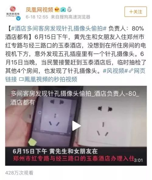 6 月 15 日,从外地到河南郑州游玩的一对情侣,发现在其入住酒店房间的一插座内有针孔摄像头。酒店方对此却不以为意,称在郑州 80% 的酒店都有这种情况;