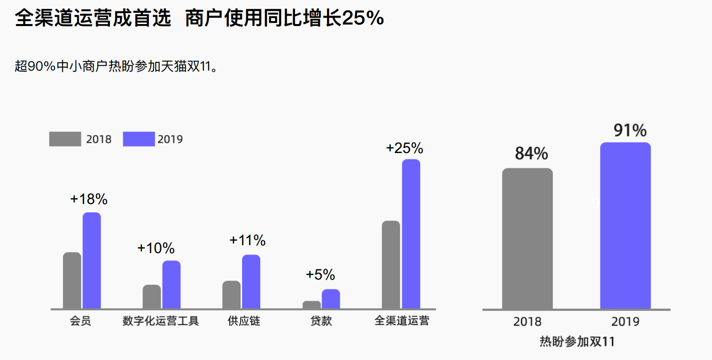 《报告》显示,今年有 91% 的中小商户期待参加天猫双 11。订单增长、新客增长、转化率提高、金融支持等是中小商户参加天猫双 11 最强烈的需求。也有超 70% 的中小商户,期待通过天猫双 11 锻炼高峰运营能力。