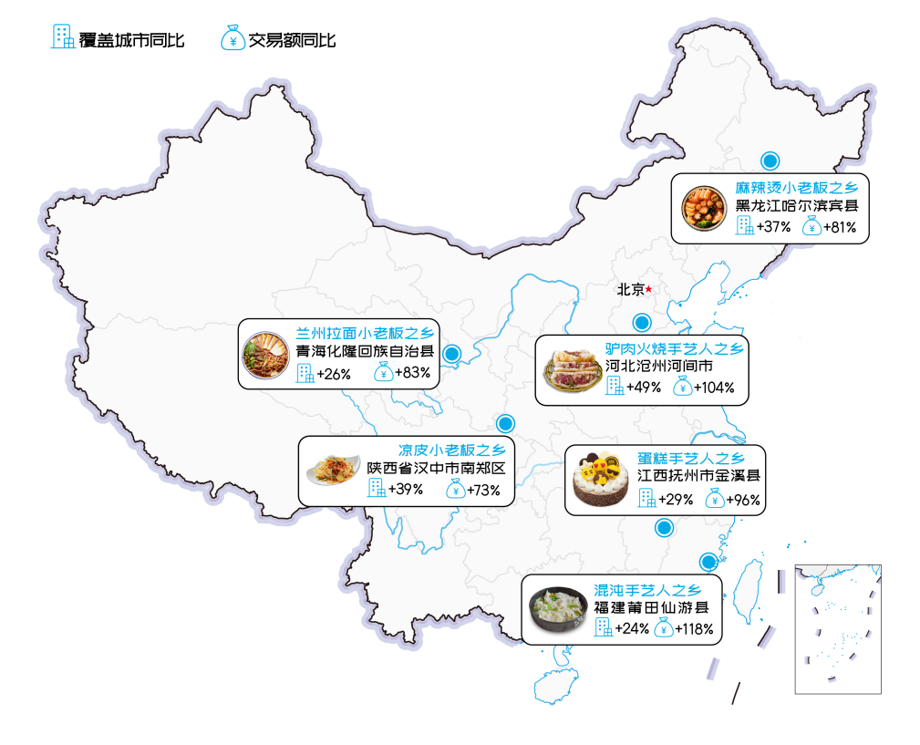 值得一提的是,一些相对传统的特色产业,也借助平台有了「走出去」的机会,覆盖越来越多城市,形成产业带规模化效应。数据显示,全国范围内经营兰州拉面的商户中,来自青海化隆的最多,来自当地经营户的收入较去年增长 83%;陕西汉中南郑区则是凉皮手艺人之乡,该县老板的凉皮收入同比增长 73%;黑龙江哈尔滨宾县作为麻辣烫手艺人之乡,交易额同比增长 81%;而福建莆田仙游县是馄饨手艺人之乡,交易额同比增长 118%。