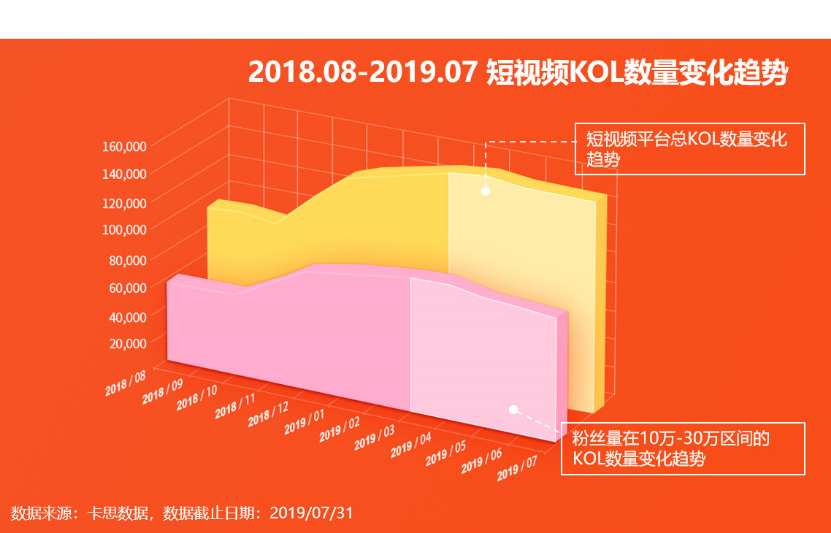研究2018年8月-2019年7月一年里短视频平台KOL数量变化,火星营销研究院发现:在过去的一年里,KOL整体处于增长的状态,但从2019年4月开始,KOL的整体数量出现下滑,并在余下的4个月里持续缓滑。