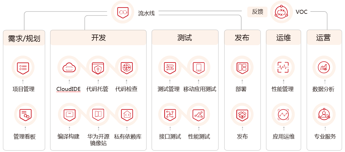 华为云DevCloud实现了端到端DevOps,覆盖了软件交付的全生命周期环节。目前,已经提供了项目管理、代码托管、流水线、代码检查、编译构建、云测(测试管理、接口测试、性能测试)、部署、发布、应用运维管理、应用性能管理、CloudIDE、华为开源镜像站、Mobile App 等工具和功能,并以项目为中心无缝集成各个服务产品,实现需求-计划-代码-测试用例-软件包等研发资产关联追溯。