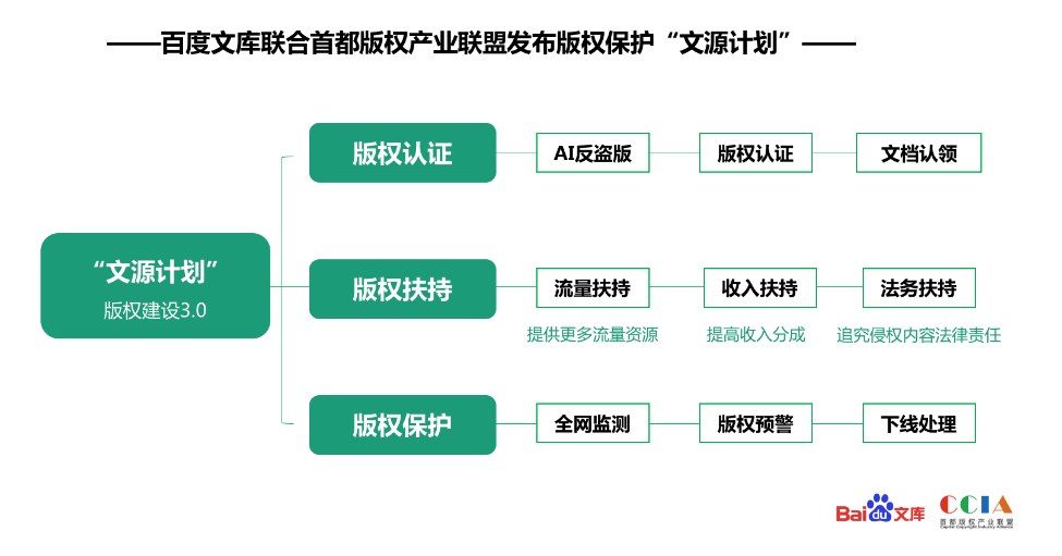 据了解,百度文库联合首都版权产业联盟等单位推出的「文源计划」打造了完善的版权服务链。首先,内容作者申请时,需要经过百度文库线上身份证确认、人工审核、反盗版反查重等检验才能成功上线;在多重检验后,首都版权产业联盟会批量快速登记百度文库文档作品的授权。同时,在保护内容版权方面,「文源计划」也将通过版权预警、代理公证诉讼等途径保障内容创作者的内容版权。