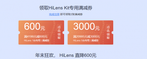 新用户登录华为云官网后,注册后即可领取2张满减券,分别HiLens Kit 1台专用满4199元减600元和5台专用满20995元减3000元券。