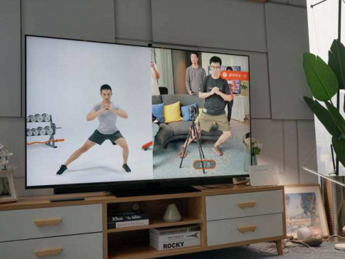 在体验AI健身时,画面会从中间分为左右两部分,分别显示教程动作和自己的动作。通过AI慧眼的智能躯体关节识别技术,华为智慧屏可以识别我的动作,并智能分析我的动作是否到位。如果没做到位还会有语音提醒我,让我不用盲目练习。