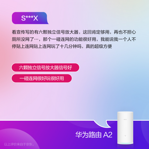 华为路由A2上市即热销,首销当天线上更是突破一万台,并很快登陆京东路由器销量排行TOP4。可以说华为路由A2以一碰连网、儿童上网保护、四核三频多连不卡、Wi-Fi接入授权、智能设备保险箱等功能创新,重构家庭Wi-Fi体验得到了广大消费者的高度认可!特别是全球首发的“一碰连网”创新功能,更是成为了消费者购买华为路由A2的TOP1因素,也成为京东好评里提及率最高的特性之一。