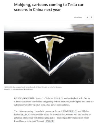 据路透社报道,从 2020 年第一季度开始,B 站视频流媒体服务将接入特斯拉全球所有车型,包括即将推出的 CyberTruck 车型。
