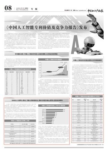 专利是当今世界上最重要的科技信息源之一,而专利信息毫无疑问是反映企业科技创新水平和企业竞争力的重要指标。日前,国家知识产权局知识产权出版社(下称知识产权出版社)i智库发布了《中国人工智能专利价值及竞争力报告》(下称《报告》)。《报告》从中国人工智能领域相关专利状况入手,重点分析了中国人工智能领域高价值专利分布情况,并结合研发实力、技术影响力等指标,对目前中国人工智能专利价值及竞争力情况进行研究分析,形成了“中国人工智能专利价值及竞争力排行榜”,以期较为全面地描绘和勾勒目前中国人工智能领域的知识产权发展情况及竞争态势。