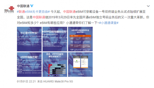 1月1日晚22点21分,联通官博正式宣布:中国联通eSIM可穿戴设备一号双终端业务,即日起将从试点陆续扩展至全国。这一举措,加上此前携号转网政策的落地,对可穿戴设备用户(尤其是智能手表用户)来说,是极大的利好。