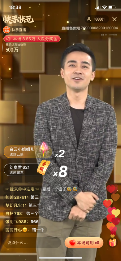 1月8日,短视频平台快手推出的大型直播答题活动“快手状元”正式启动。官方数据显示,首日三轮直播答题超500万人参与,超过100万次分享,超过16万人闯关成功,瓜分了200多万现金和1100万快币。