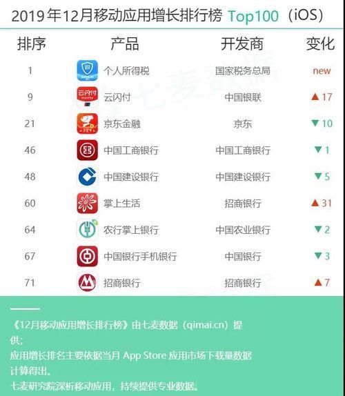 近日,七麦研究院针对12月移动应用市场变化情况,发布《2019年12月移动应用增长排行榜》。12月,游戏类产品上榜数量大幅增长,且多数为2019年新上线产品,「我功夫特牛」凭借字节跳动的买量和平台引流助力,强势成为12月增长最快产品,「新笑傲江湖」则在经典IP、流量明星加持下,一经上线便连续霸榜7天。同时,此次榜单有9款财务类App在榜,受年末个税专项扣除重新确认的强需求影响,「个人所得税」作为新进榜产品,排名一跃升至本次榜单Top1;而「云闪付」也因受“双12”影响,连续6天单日下载量预估破15w。