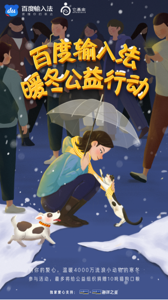 在此次公益行动中,百度输入法利用业内独创的yan皮肤功能,将网红猫咪和狗子的精品图搬上了输入法皮肤,用户每通过百度输入法“暖心小屋”界面下载一次公益萌宠皮肤,即可向它基金旗下救助基地的流浪小动物捐赠20克过冬口粮。为扩大公益参与入口,百度输入法发起#百度输入法暖冬公益行动#、#百度输入法暖冬公益大使#微博话题讨论,并制作暖心H5,从流浪猫视角呼吁公众施以爱心援手,吸引更多爱宠人士关注流浪猫狗现状。