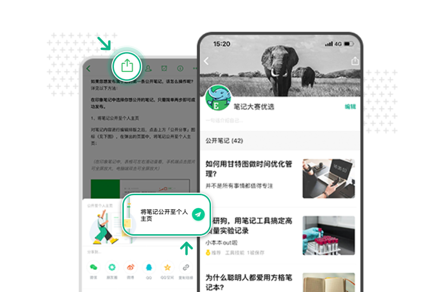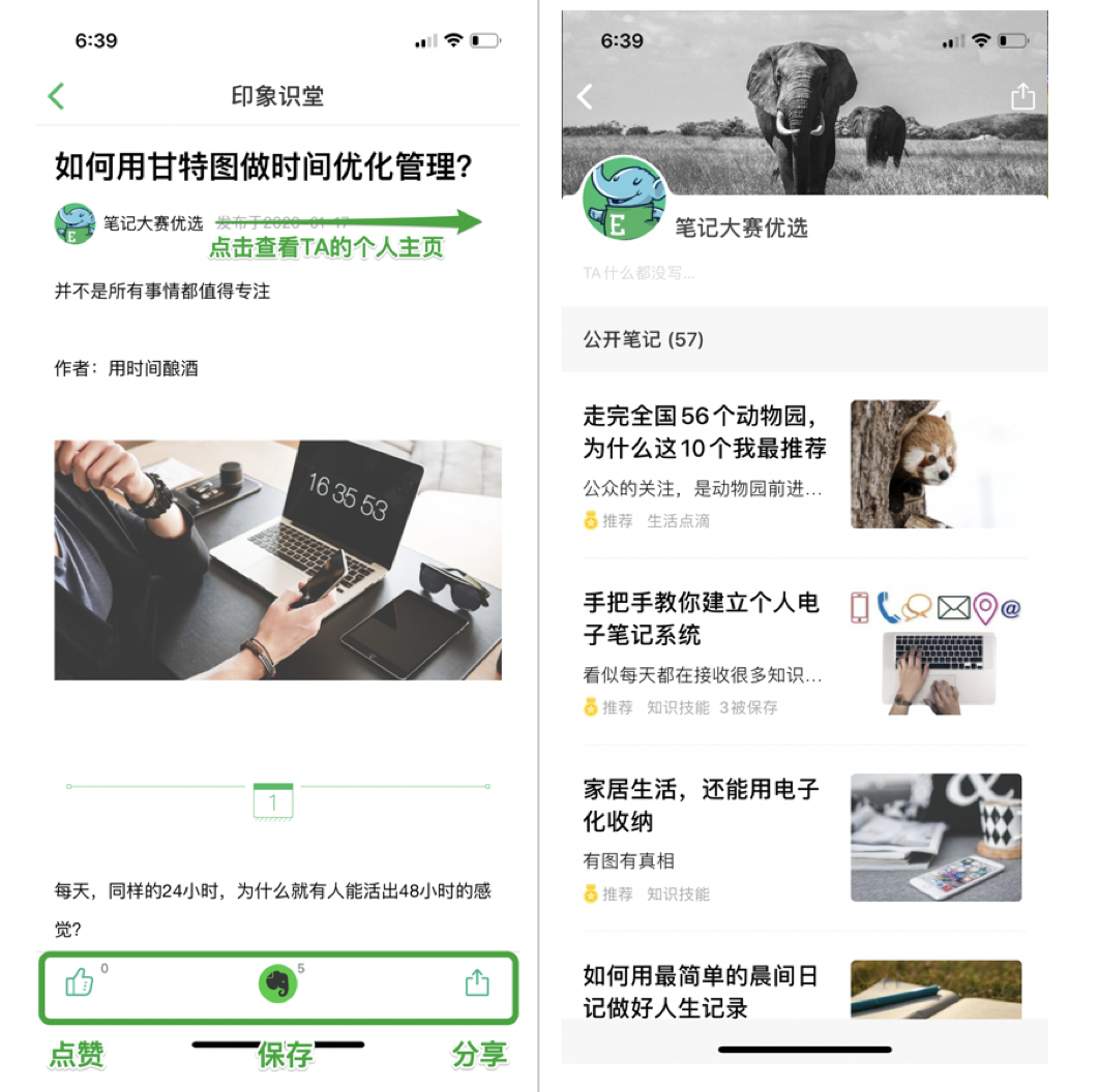 印象笔记用户将拥有专属的个人主页,用户可以在这里设置个人简介、发布自己想要公开的笔记。用户未公开发布的笔记仍然仅私人可见。根据推荐原则,用户公开发布在个人主页的优秀笔记将有机会出现在印象识堂中,供所有印象笔记用户阅读、点赞及保存。当然,用户还可以将个人主页通过微信、小程序、微博、QQ 等渠道分享给好友,邀请好友浏览自己所有的公开笔记。