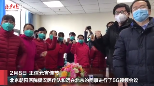 通过华为WeLink的云视讯和5G技术,北京朝阳医院与武汉协和医院西院区的两间会议室联成了一体。隔着屏幕,后方医护人员、家属也为前线送去了节日的祝福。