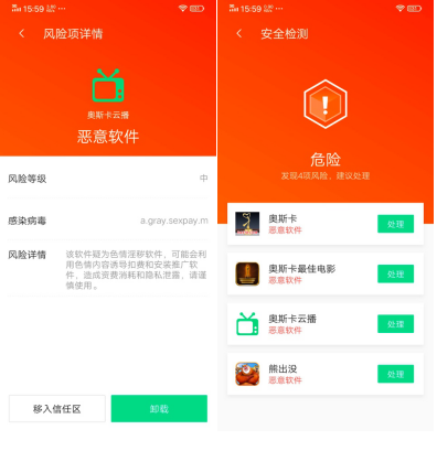 (图:腾讯手机管家精准查杀“奥斯卡云播”等4款病毒软件)