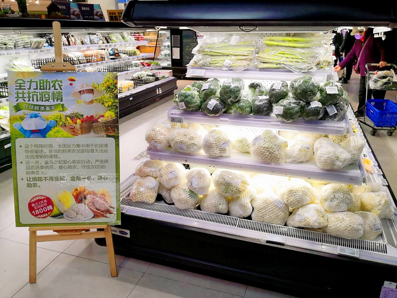 今年春节至今,盒马门店的蔬菜瓜果却供不应求,大量的居民依托超市解决一日三餐,对于民生商品的需求远超平时。爱心助农,既是为农民解难,也是为市民填满菜篮子。