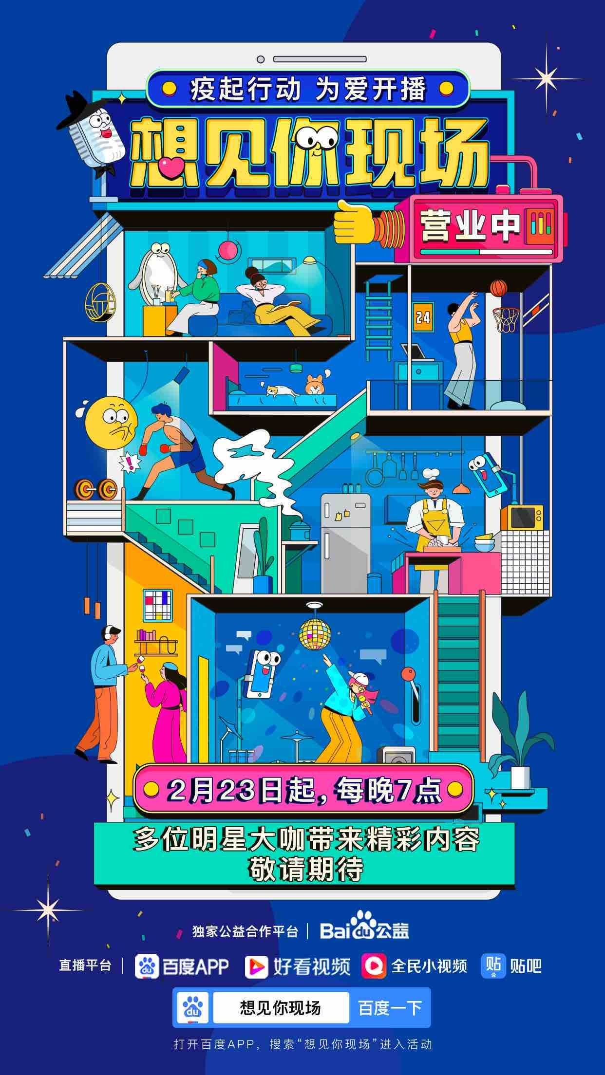 在2月23日到3月3日期间,百度App的“想见你现场”明星公益演出每晚7点正式营业,冯提莫、黄雅莉、果味VC、李斯丹妮、水木年华、斯琴格日乐……众多明星艺人会在以百度App为主的四个客户端同步为大家送上独家演出内容。
