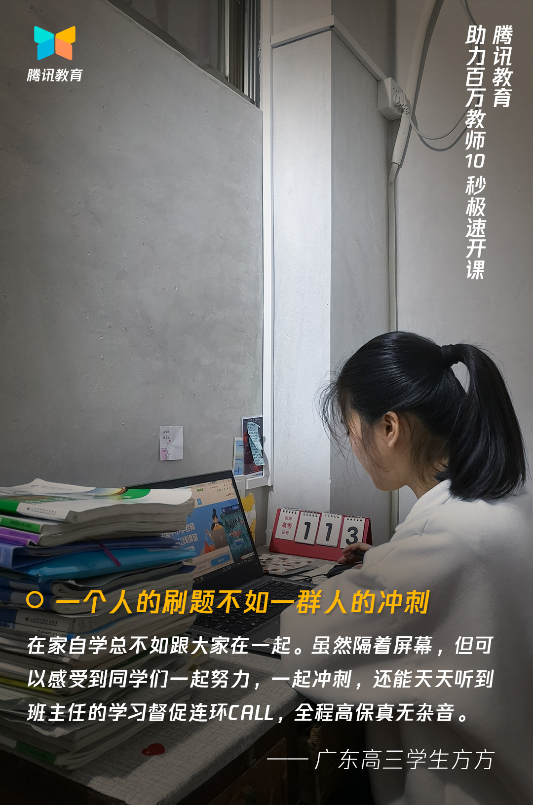 3 月 2 日,广东、上海等多个地区,正式在线上课。作为技术支持方和云资源提供者,腾讯教育助力教育主管部门搭建了全域在线学习平台。同时,针对不同区域、不同人群的多样化、个性化需求,打造了一整套包括在线直播、在线点播、在线课堂互动、协同办公、教务教学管理在内的「全家桶」解决方案,供学校、师生和家长们自由选择。
