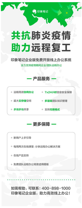 为了支持企业共抗疫情,印象笔记自1月29日免费开放企业版远程办公系统。一个月以来,印象笔记收到了近万家企业的申请和数万人次的咨询。印象笔记同时还和黑马大学、36kr、CSDN、宽带资本等媒体和机构一起,为十万逾名企业家和创业者提供了针对"疫情期间线上办公"和"云上信息建设"的在线分享和课程。