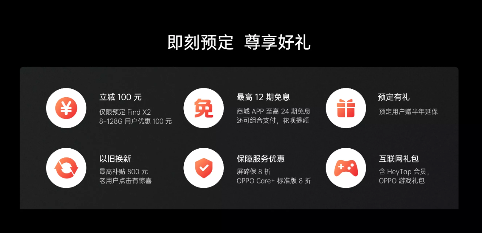 在 OPPO 商城、天猫旗舰店、京东和苏宁易购预定 OPPO Find X2 系列手机,享受定金立减 100 元优惠、最高 24 期免息分期以及半年延保服务的福利政策。消费者最低日付 7.4 元,便可得到一款集顶级性能、屏幕、影像实力于一体的 5G 全能旗舰。