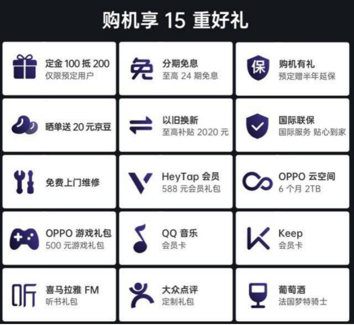 天猫超品日拥有「购机享 15 重好礼」活动,不仅提供最高 24 期免息分期及半年延保服务等福利,还提供丰富多样的互联网服务权益,包括 HeyTap 会员、OPPO 云空间、OPPO 游戏礼包等与产品密切相关的服务权益。