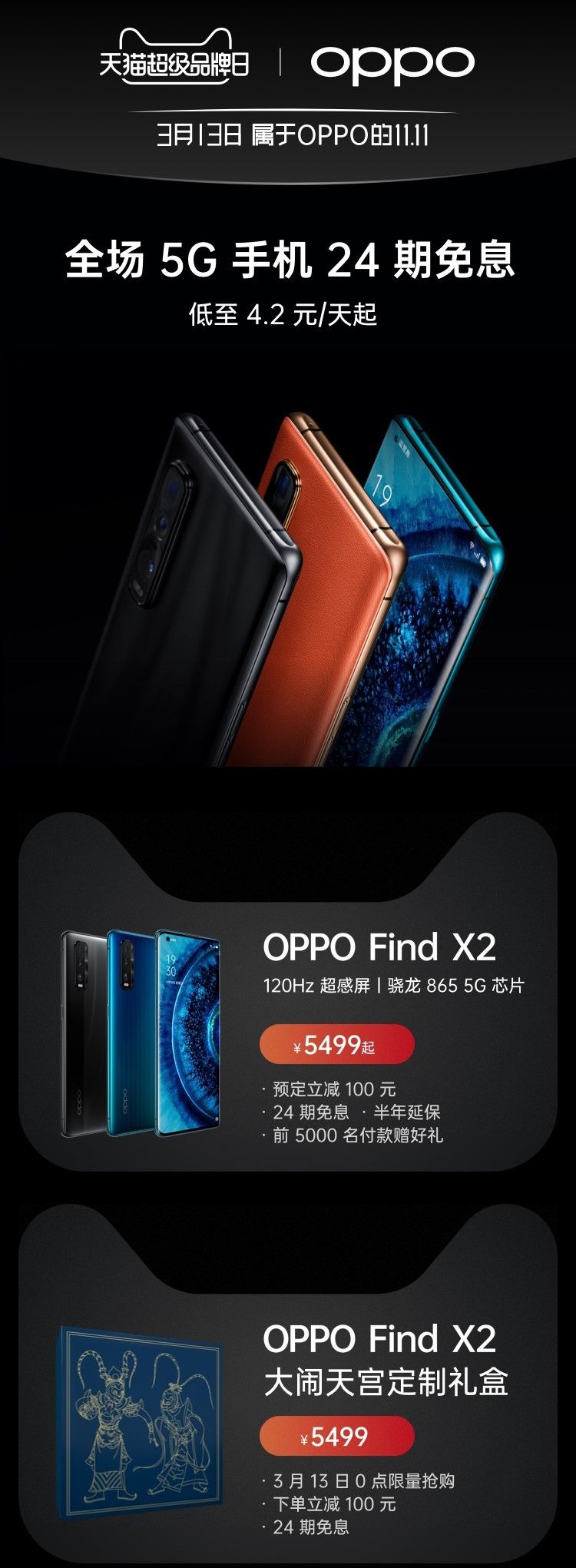 OPPO Find X2 系列首销在即,OPPO 与天猫超级品牌日再度开启合作,购机享受最高 24 期免息分期权益的同时,也将在 13 日 0 点开抢大闹天宫限量礼盒,内含大闹天宫原画手机壳及 OPPO Heytap 会员等精美周边。