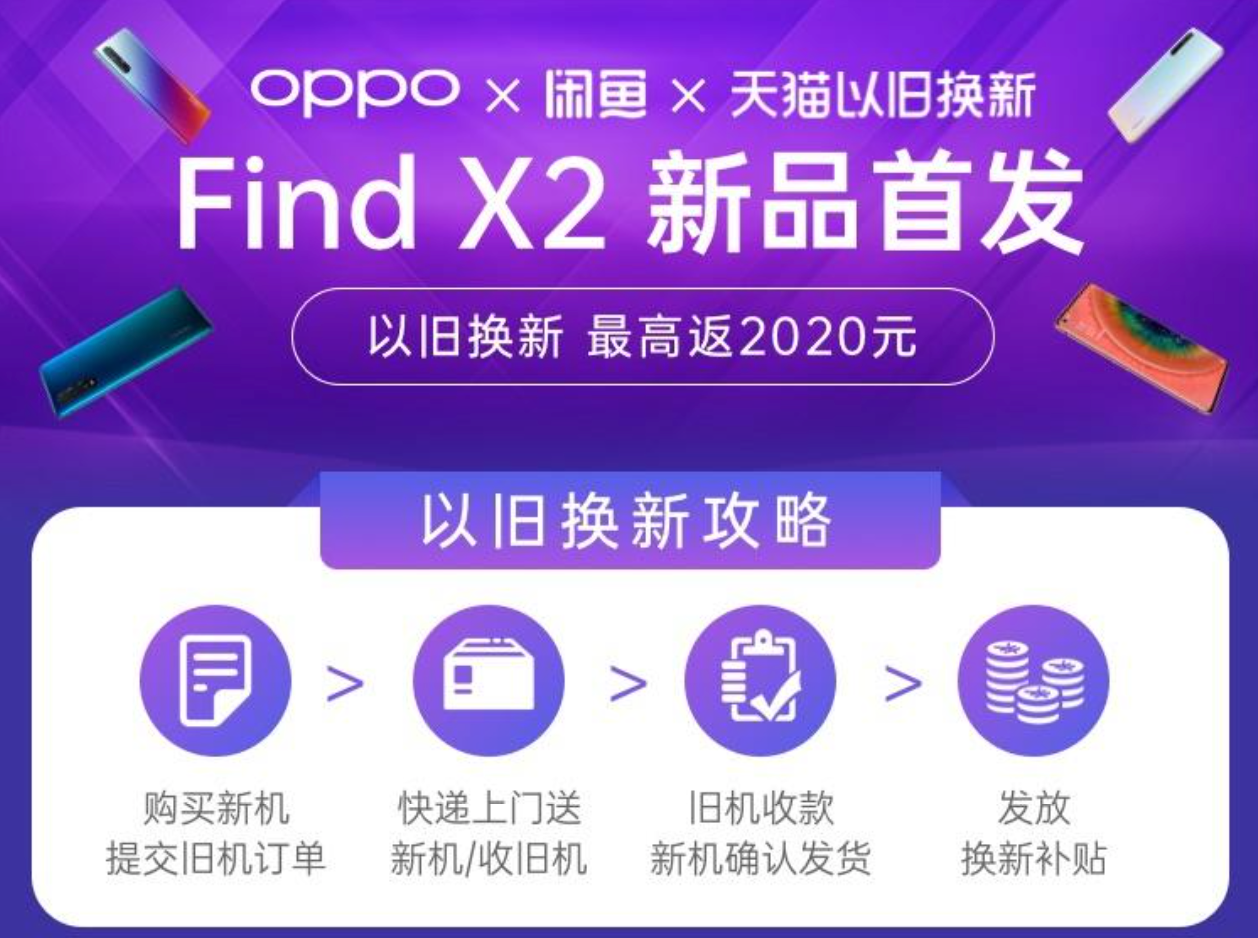 OPPO Find X2 系列新品参与以旧换新活动,消费者在 OPPO 以旧换新活动页面回收闲置手机,并在 OPPO 官方旗舰店购买 OPPO Find X2 系列手机,可在回收成交价基础上再获