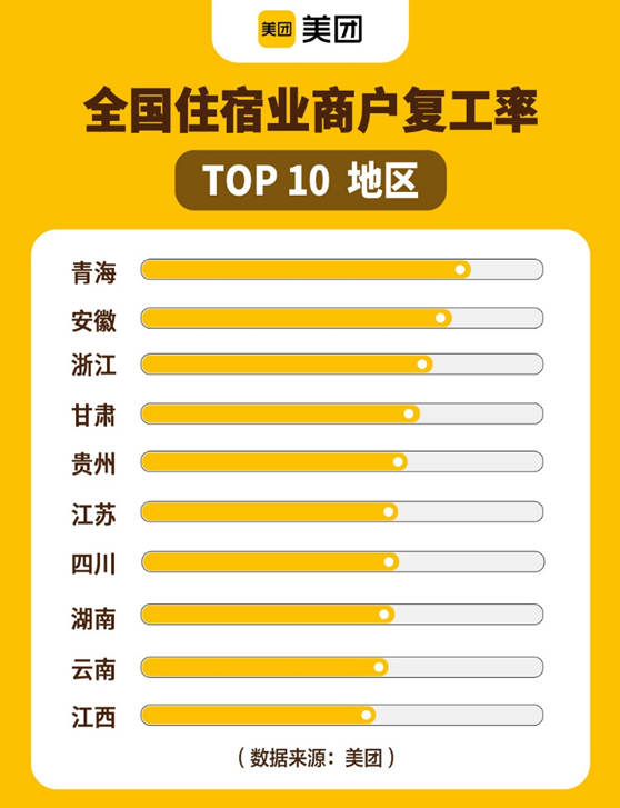 日前,记者从美团获悉,全国住宿业商户复工率top10城市出炉,青海、安徽、浙江、甘肃、贵州、江苏、四川、湖南、云南、江西等地区都超过了70%。为促进全国各省市旅游消费进一步回暖,美团于4月1日宣布启动“安心出游节”,继续以“安心”服务促进旅游消费加速复苏。