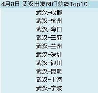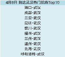 4 月 8 日,武汉-成都航线是去哪儿网平台上武汉出发的最热门航线,其平均价格为 944 元;武汉-杭州、武汉-海口两条航线是热度排名第二、第三的航线,平均价格分别是 782 和 1190 元。