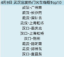 去哪儿网数据显示,武汉-广州南成为 8 日最热门火车线路。此外,热门火车线路还有武汉-长沙南、武汉-深圳北、武汉-上海虹桥和汉口-重庆北等。