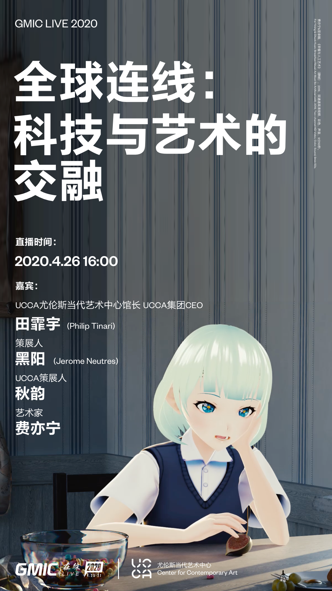 2020 年 4 月 26 日,UCCA 尤伦斯当代艺术中心首次亮相全球科技风向标——GMIC 全球移动互联网大会。在大会两天三晚的活动期间,共有四千余万观众在线参与,超过 200 多场围绕科技、商业、全球化等话题的主题演讲和圆桌论坛在这里上演。在 GMIC 在 线 2020 的主舞台上,UCCA 为广大线上观众带来最前沿的艺术讯息,纵览科技与艺术彼此间的密切关系与深入影响,以及在疫情影响之下,艺术创作、艺术机构和艺术行业新的转变。出席这场直播活动的嘉宾有:UCCA 尤伦斯当代艺术中心馆长、UCCA 集 团 CEO 田霏宇、法国策展人黑阳、UCCA 策展人秋韵和艺术家费亦宁。