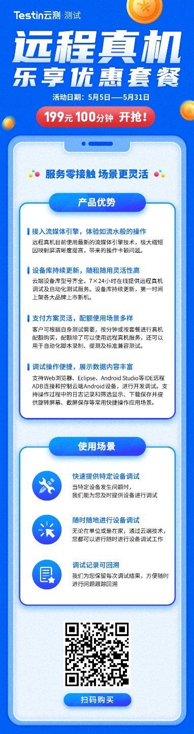 Testin云测远程真机服务为企业提供高效的云端设备调试,把测试变成标准化服务,通过将测试设备放到云端来进行测试,企业可以在全球任何地点、任何时间提交测试任务到云测试平台,不受时间和地域的限制,非常适合企业在复工复产期间迅速完成对软件系统质量的超高保证。