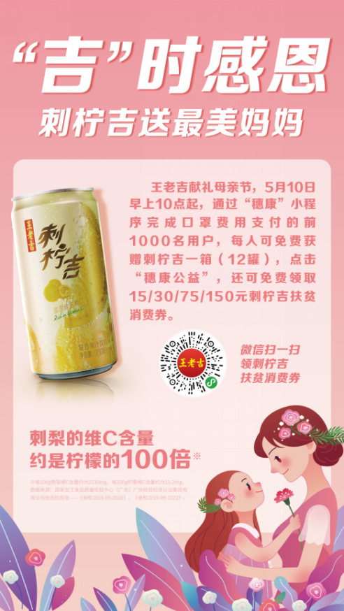 五一小长假刚结束,5月10日母亲节又如约而至。为向天下母亲表达诚挚祝福,王老吉开展“'吉'时感恩——刺柠吉送给最美妈妈”活动,推出双重福利,献礼母亲节。