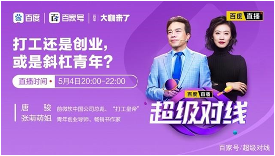 5月4日晚,著名的“打工皇帝”唐俊和“创业女神”张萌,也在百度直播里,把“打工还是创业,或是斜杠青年?”这个问题为网友们辩了个明白。