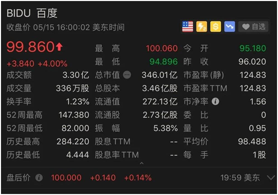 李彦宏结束直播首秀后,百度股价应声而涨。当晚,百度股价从开盘时的