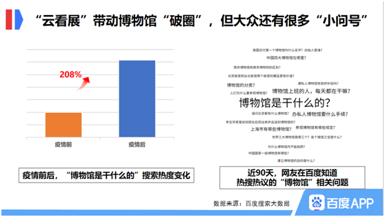 博物馆和直播的结合,被网友们亲切地称为“云看展”。“云看展”不仅满足了对文博知识有需求的人群,更将博物馆带到了更广泛的人群中,形成了一次“破圈”。百度搜索大数据显示,“博物馆是干什么的”这个问题较疫情前搜索热度上涨了