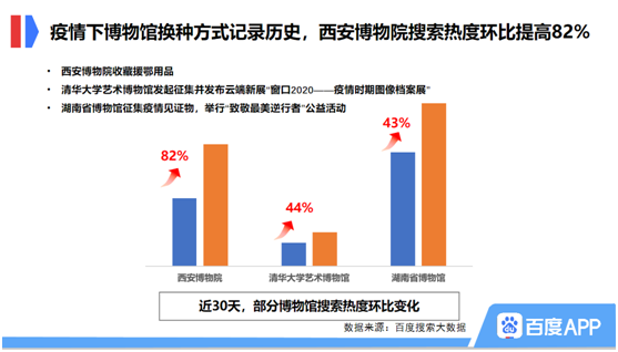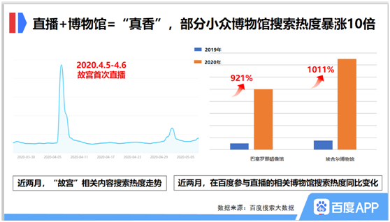 疫情和隔离催生了“直播热”,文博行业也乘着直播的东风,收获了社会各界的热烈反响。作为闭馆期间博物馆提供文化服务的一种新方式,直播已成为文博行业数字化发展的新趋势。百度搜索大数据显示,近两个月,“故宫博物院”相关搜索内容的波峰就出现在故宫首次直播之中。此外,海内外各大博物馆在百度的直播,也将大量优质博物馆带到网友面前,部分小众博物馆因此搜索热度暴涨,其中“巴塞罗那蜡像馆”搜索热度同比上涨