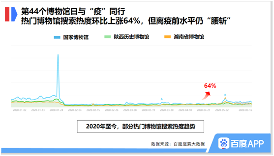 2020年5月18日是第44个“世界博物馆日”。在新冠肺炎疫情的影响下,各大博物馆、艺术馆纷纷闭馆,百度搜索大数据显示,1月22日以来,各大知名博物馆均遭遇了搜索热度的大跳水。而近期由于疫情防控一路向好,博物馆纷纷重开,近30天搜索热度环比上涨64%,但距离疫情前热度仍处“腰斩”水平。