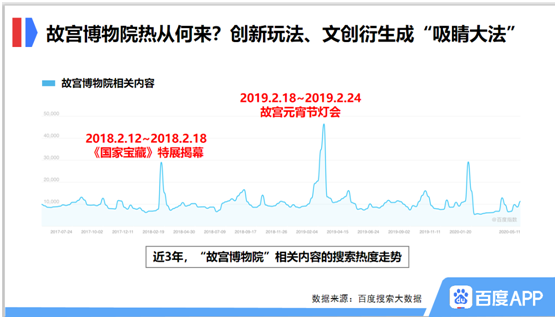 百度搜索大数据还揭示了故宫博物院修炼成博物馆界的“超级网红”的秘密:除了自身的传统优势,故宫博物院近年来开发不少创新玩法,如和《国家宝藏》合作特展、举办故宫元宵节灯会等等,均为故宫博物院带来搜索热度的飙升。