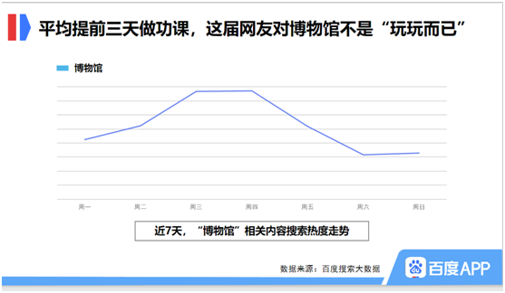 参观博物馆是一时兴起的行为吗?百度搜索大数据的答案是否定的。博物馆相关内容的热度在每周三、四达到峰值,周末则是低谷。百度搜索大数据表明,人们去博物馆参观前,往往会提前三天左右做功课,对博物馆的基本信息以及历史、藏品、看点等进行全方位的了解。这届网友对博物馆可不是“玩玩而已”。