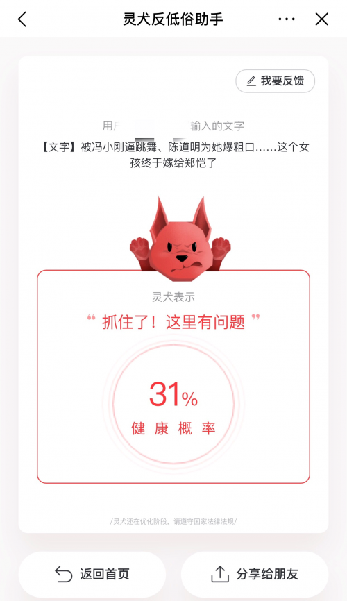 从这些检测来看,只要我们在“灵犬”内输入一段文本,“灵犬”可以迅速给出反馈。在当前网络内容参差不齐的情况下,尤其是用户观看一篇文章时,难以判断是否存在低俗低质内容的情况下,“灵犬”则可以在三秒左右帮助用户检测出结果。此外,对于一些内容创作者来说,“灵犬”也能帮助其自测,提前排除文章中的低俗低质内容。