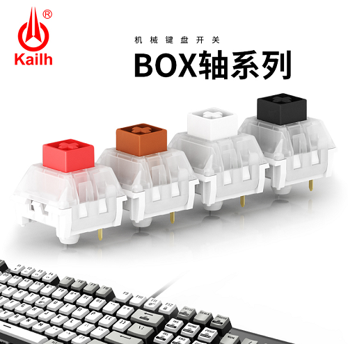 2015年凯华推出全球首款防尘防水的BOX轴,BOX轴搭载在机械键盘中可以增强键盘的保护性,大大延长了机械键盘的使用寿命。BOX轴整体采用棱角分明的方正设计语言,可以排出意外浸入的水渍,基座上盖部分,采用左右卡榫设计方式,单侧卡榫为一体式结构,合盖后严丝合缝,肉眼几乎难以准确看到缝隙,能够有效阻止大颗粒尘霾进入腔体内部。