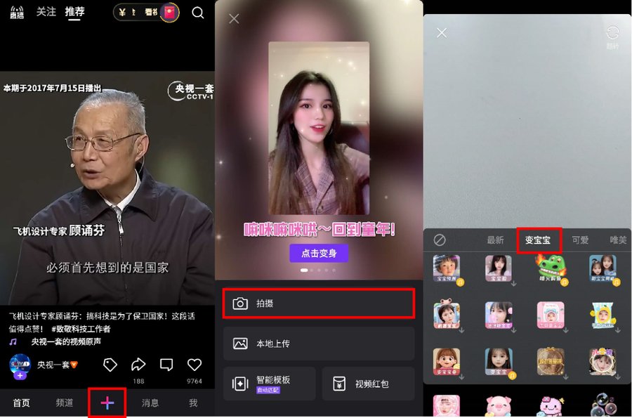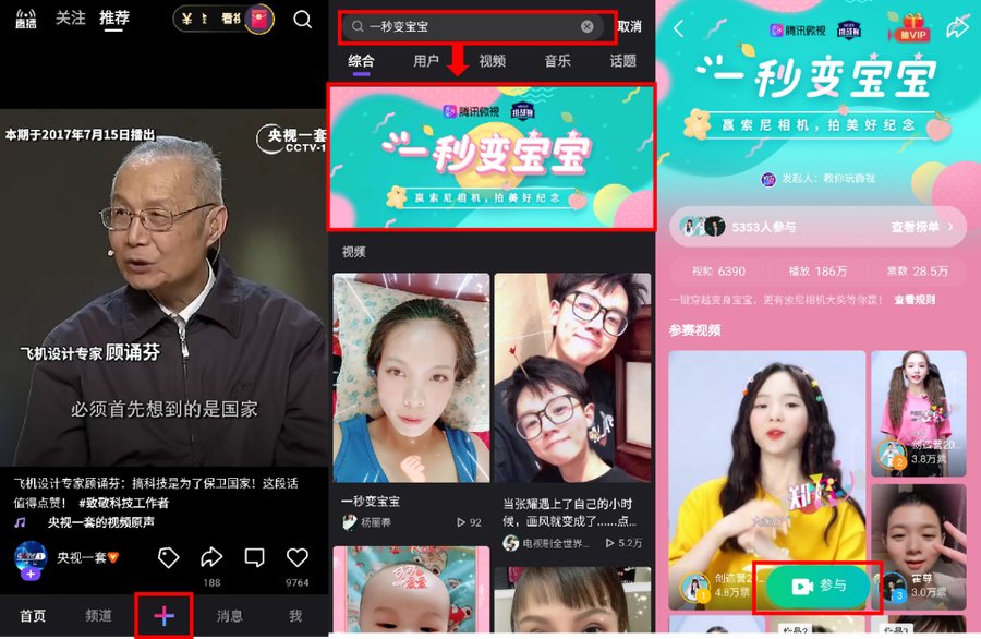 想要一秒“变宝宝”,用户可以在腾讯微视APP里,点击“+”拍摄,在“魔法-变宝宝”中选择相应挂件进行拍摄;或者在腾讯微视APP中,搜索进入#一秒变宝宝#挑战赛,点击“参与”进入拍摄界面,选择喜欢的挂件就可以进行拍摄,一秒化身小时候的你。