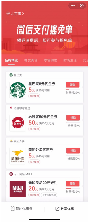 活动期间,在京消费者可通过微信搜一搜、线下面对面扫码、线上分享等方式进入“微信支付商家消费券”小程序领券;也可通过央视财经小程序进入,在微信中搜一搜“全国消费券”或“央视财经”进行领券。其中,包括了便利蜂、西贝莜面村、阿迪达斯等多家知名品牌商家,涵盖餐饮、零售、时尚、交通住宿、美妆个护、生活服务等行业,此外,用户还可以参与摇免单活动。