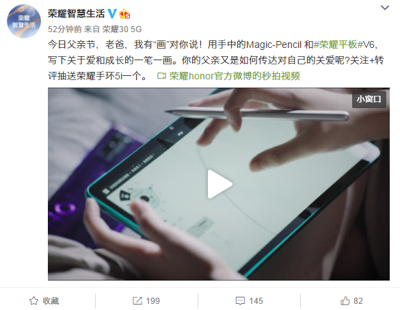 6 月 21 日,荣耀官微发布父亲节感恩视频引发了广泛共鸣,网友纷纷转发并留言表示「瞬间泪目」。不久前,荣耀平板 V6 刚在荣耀 Life 沈阳店开业现场公布了售价,6 月 18 日一开售便赢得了京东平台安卓平板品类单品销量冠军以及天猫 2000-3000 价位段安卓平板品类销量、销售额双冠军。如今这款热门平板又在父亲节之际打造了这支爆款走心的视频,着实赢得了不少好感和关注。