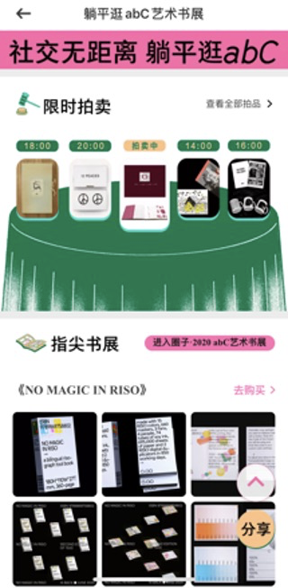 打开躺平 APP,通过首页限时海报入口或搜索「abC 艺术书展」关键词,进入 abC 线上艺术展专属活动页,即可开启躺平逛展的体验,此次线上展共分为四个板块「abC TV 视频展映」、「指尖书展」、「线下书展购票优惠」、「限时拍卖」。其中,「限时拍卖」单元是作为线上特别策划推出,会在活动期间的每日 12:00-22:00 每两小时上拍一件物超所值的作品。